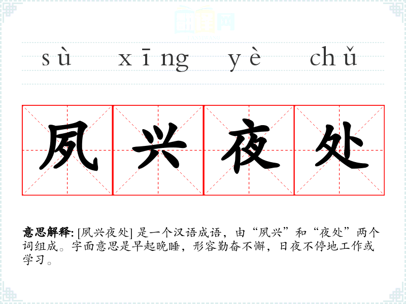[夙兴夜处] 是一个汉语成语,由“夙兴”和“夜处”两个词组成。字面意思是早起晚睡,形容勤奋不懈,日夜不停地工作或学*。
