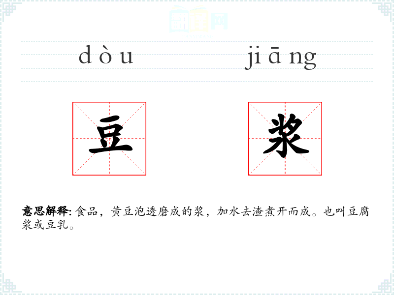 食品,黄豆泡透磨成的浆,加水去渣煮开而成。也叫豆腐浆或豆乳。