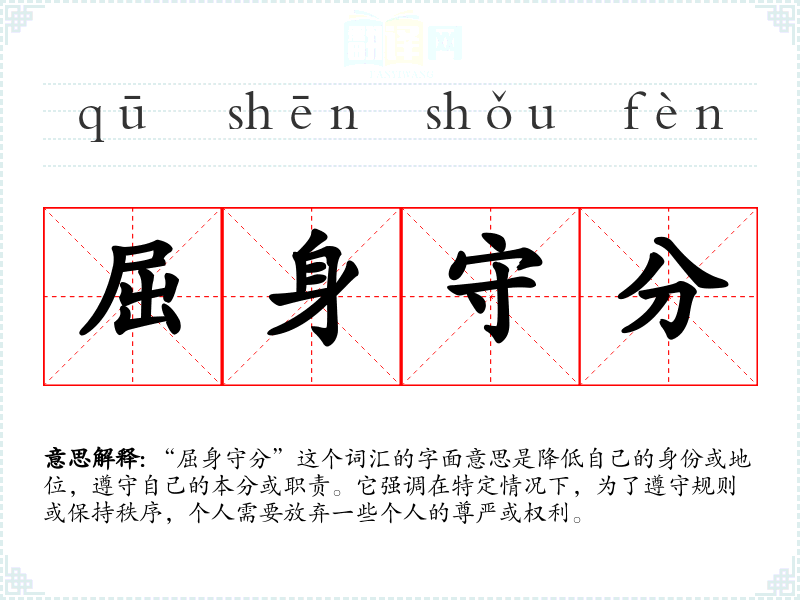 “屈身守分”这个词汇的字面意思是降低自己的身份或地位,遵守自己的本分或职责。它强调在特定情况下,为了遵守规则或保持秩序,个人需要放弃一些个人的尊严或权利。