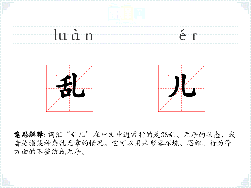 词汇“乱儿”在中文中通常指的是混乱、无序的状态,或者是指某种杂乱无章的情况。它可以用来形容环境、思维、行为等方面的不整洁或无序。
