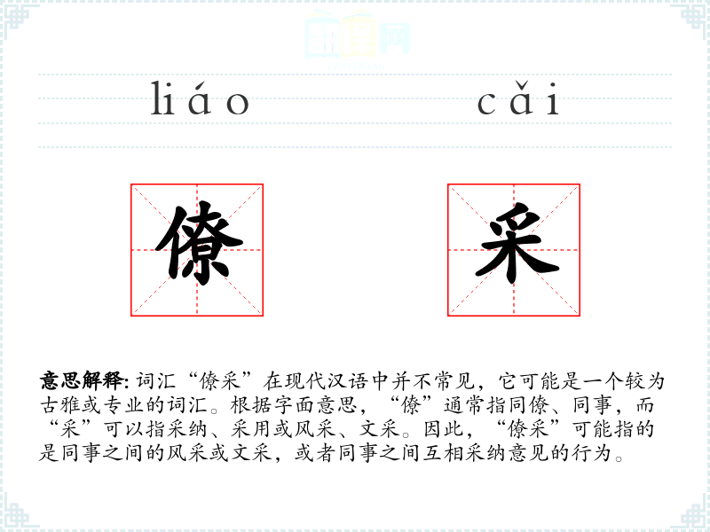 - 理解:僚采是一个富有文化内涵的词汇,体现了古代文人官员之间的和谐与尊重。