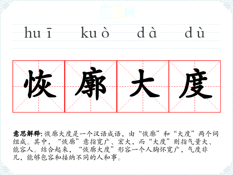 “恢廓”一词最早见于《左传》等古代文献,原意为宽广、宏大。而“大度”则是一个较为常见的词汇,意指气量大。两者结合成“恢廓大度”后,其含义更加丰富,强调了宽广的胸怀和气度。