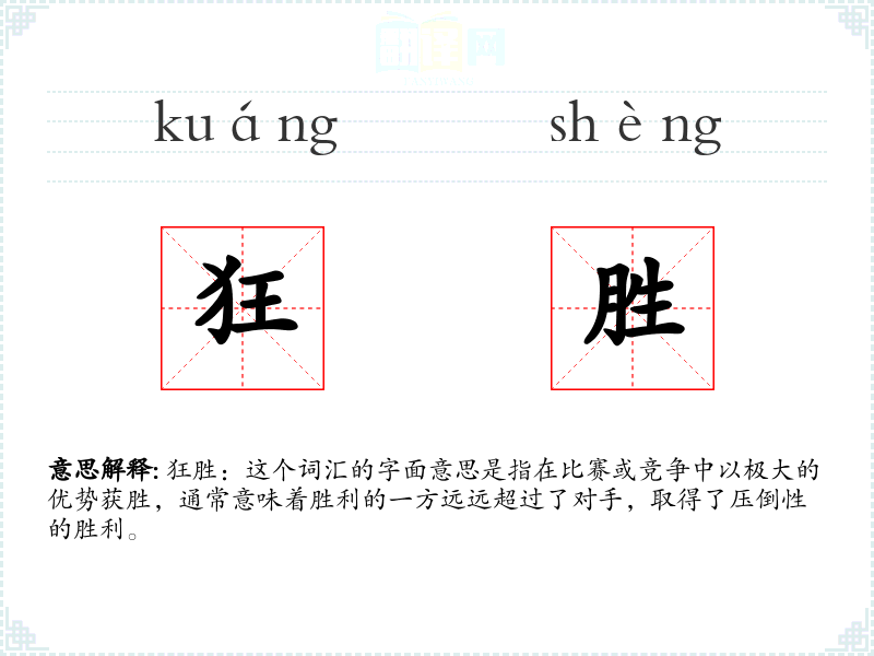 “狂胜”由“狂”和“胜”两个字组成。“狂”字在中文中通常有疯狂、极端的含义,而“胜”则表示胜利。这个词汇可能是近代汉语中形成的,用以强调胜利的极端性和压倒性。
