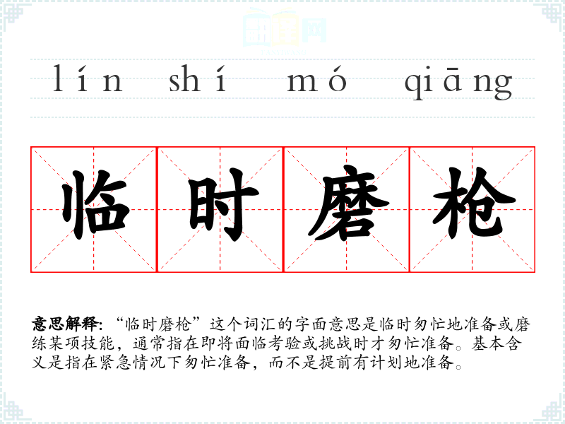 “临时磨枪”这个词汇的字面意思是临时匆忙地准备或磨练某项技能,通常指在即将面临考验或挑战时才匆忙准备。基本含义是指在紧急情况下匆忙准备,而不是提前有计划地准备。