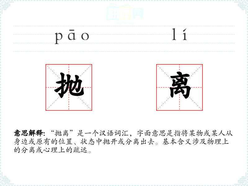 “抛离”是一个汉语词汇,字面意思是指将某物或某人从身边或原有的位置、状态中抛开或分离出去。基本含义涉及物理上的分离或心理上的疏远。