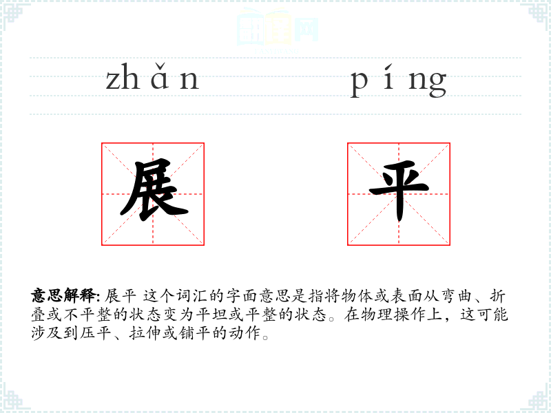 展平 这个词汇的字面意思是指将物体或表面从弯曲、折叠或不平整的状态变为平坦或平整的状态。在物理操作上,这可能涉及到压平、拉伸或铺平的动作。