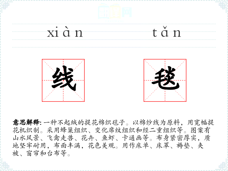 1.一种不起绒的提花棉织毯子。以棉纱线为原料,用宽幅提花机织制。采用蜂巢组织、变化席纹组织和经二重组织等。图案有山水风景、飞禽走兽、花卉、鱼虾、卡通画等。布身紧密厚实,质地坚牢耐用,布面丰满,花色美观。用作床单、床罩、褥垫、夹被、窗帘和台布等。