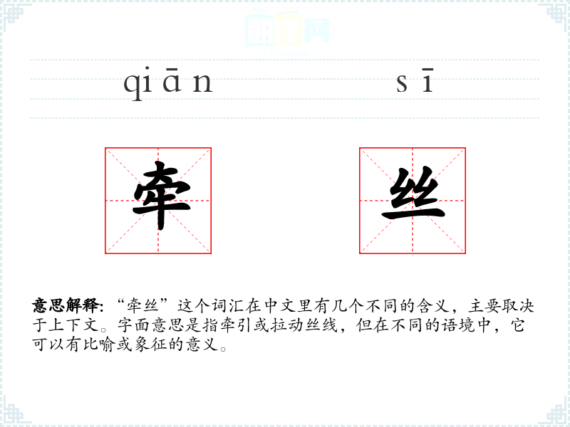 - 口语:在日常对话中,“牵丝”可能指实际的编织或缝纫活动,如“她在家里牵丝做手工”。