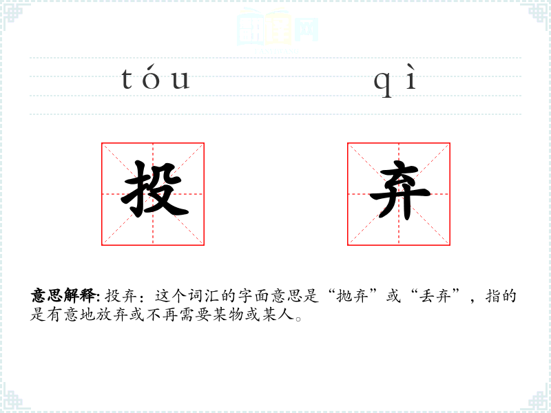 投弃:这个词汇的字面意思是“抛弃”或“丢弃”,指的是有意地放弃或不再需要某物或某人。