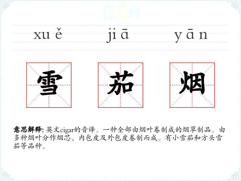 英文cigar的音译。一种全部由烟叶卷制成的烟草制品。由多种烟叶分作烟芯、内包皮及外包皮卷制而成。有小雪茄和方头雪茄等品种。