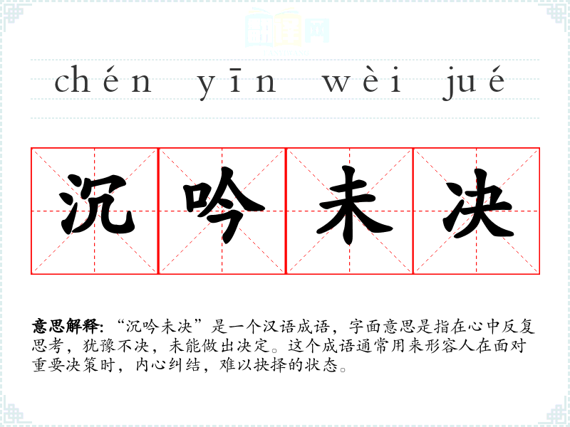 “沉吟未决”是一个汉语成语,字面意思是指在心中反复思考,犹豫不决,未能做出决定。这个成语通常用来形容人在面对重要决策时,内心纠结,难以抉择的状态。