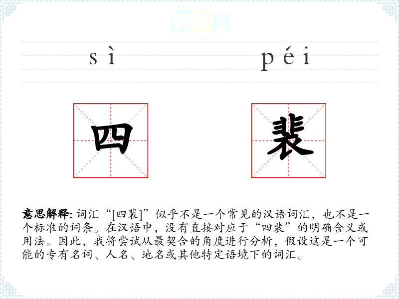 词汇“[四裴]”似乎不是一个常见的汉语词汇,也不是一个标准的词条。在汉语中,没有直接对应于“四裴”的明确含义或用法。因此,我将尝试从最契合的角度进行分析,假设这是一个可能的专有名词、人名、地名或其他特定语境下的词汇。