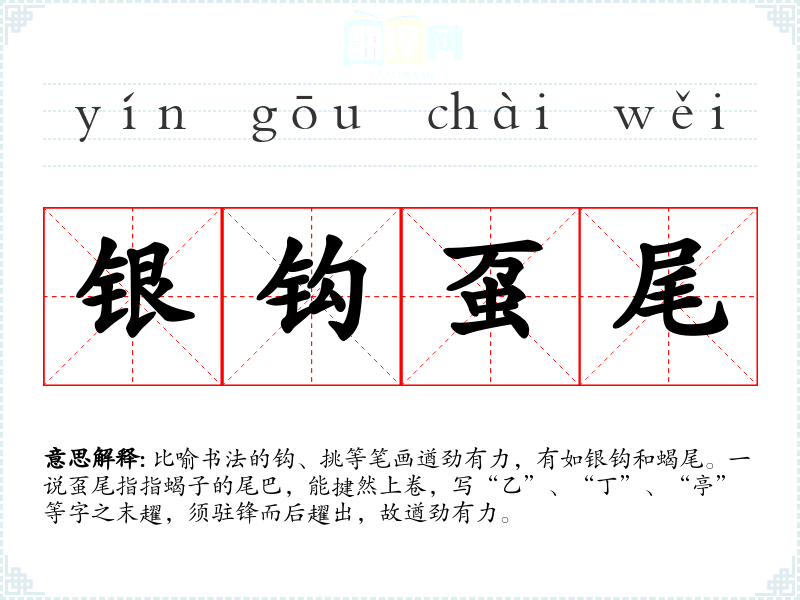 比喻书法的钩、挑等笔画遒劲有力,有如银钩和蝎尾。一说虿尾指指蝎子的尾巴,能揵然上卷,写“乙”、“丁”、“亭”等字之末趯,须驻锋而后趯出,故遒劲有力。