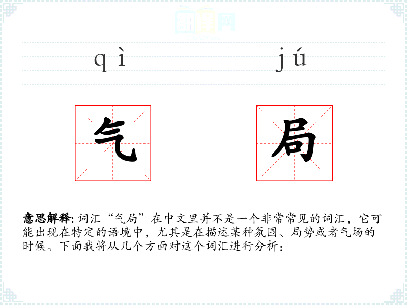 - 反义词:无(由于“气局”不是一个常用词汇,反义词不明显)