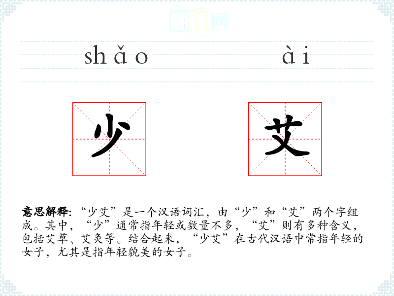 “少艾”是一个汉语词汇,由“少”和“艾”两个字组成。其中,“少”通常指年轻或数量不多,“艾”则有多种含义,包括艾草、艾灸等。结合起来,“少艾”在古代汉语中常指年轻的女子,尤其是指年轻貌美的女子。