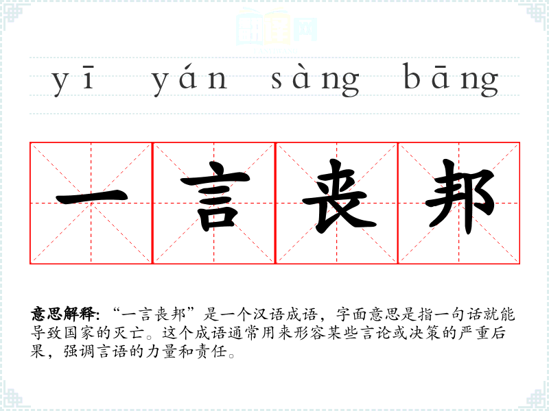 “一言丧邦”是一个汉语成语,字面意思是指一句话就能导致国家的灭亡。这个成语通常用来形容某些言论或决策的严重后果,强调言语的力量和责任。