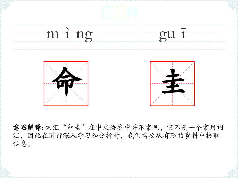 词汇“命圭”在中文语境中并不常见,它不是一个常用词汇,因此在进行深入学*和分析时,我们需要从有限的资料中提取信息。