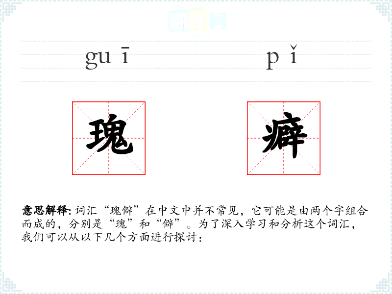 词汇“瑰僻”在中文中并不常见,它可能是由两个字组合而成的,分别是“瑰”和“僻”。为了深入学*和分析这个词汇,我们可以从以下几个方面进行探讨: