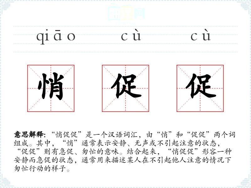- 文学语境:在文学作品中,“悄促促”常用来描绘人物在紧张或秘密情境下的行为,如侦探小说中侦探悄悄接近目标的场景。