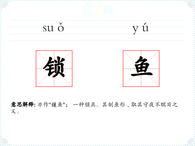 亦作"鏁鱼"; 一种锁具。其制鱼形﹐取其守夜不瞑目之义。
