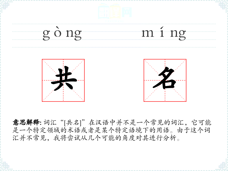 词汇“[共名]”在汉语中并不是一个常见的词汇,它可能是一个特定领域的术语或者是某个特定语境下的用语。由于这个词汇并不常见,我将尝试从几个可能的角度对其进行分析。
