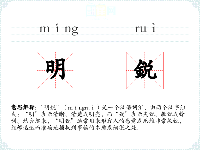 “明鋭”的词源较为直接,由“明”和“鋭”两个字组成,这两个字在古代汉语中已有使用,且含义与现代汉语基本一致。随着时间的推移,“明鋭”这个词的使用范围和语境有所扩展,但其基本含义保持不变。