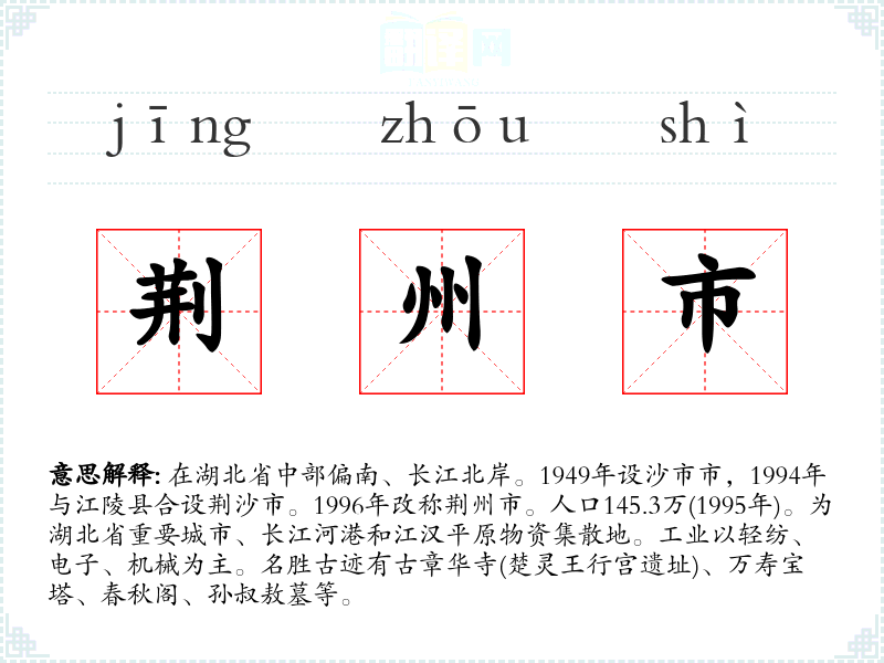 1.在湖北省中部偏南、长江北岸。1949年设沙市市,1994年与江陵县合设荆沙市。1996年改称荆州市。人口145.3万(1995年)。为湖北省重要城市、长江河港和江汉平原物资集散地。工业以轻纺、电子、机械为主。名胜古迹有古章华寺(楚灵王行宫遗址)、万寿宝塔、春秋阁、孙叔敖墓等。
