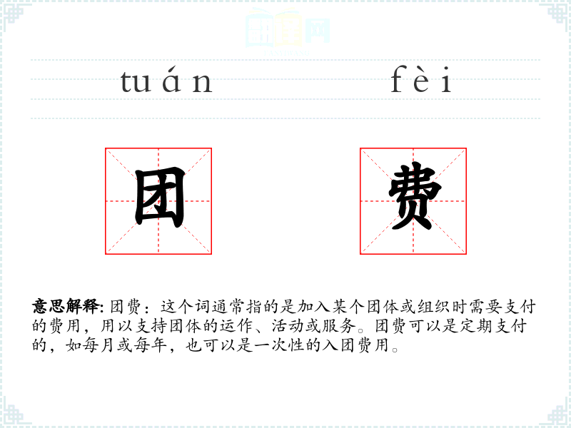 团费:这个词通常指的是加入某个团体或组织时需要支付的费用,用以支持团体的运作、活动或服务。团费可以是定期支付的,如每月或每年,也可以是一次性的入团费用。