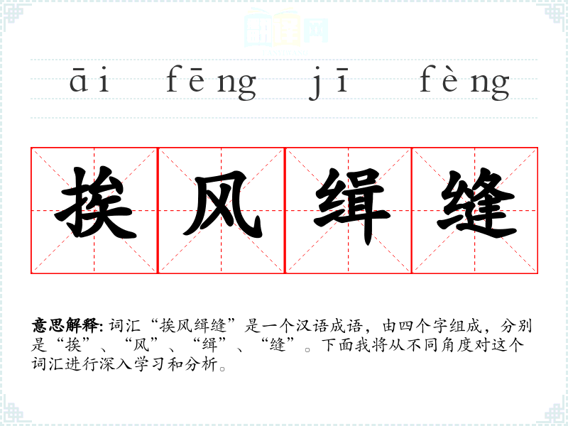词汇“挨风缉缝”是一个汉语成语,由四个字组成,分别是“挨”、“风”、“缉”、“缝”。下面我将从不同角度对这个词汇进行深入学*和分析。