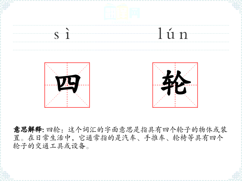 四轮:这个词汇的字面意思是指具有四个的物体或装置。在日常生活中,它通常指的是汽车、手推车、轮椅等具有四个的交通工具或设备。