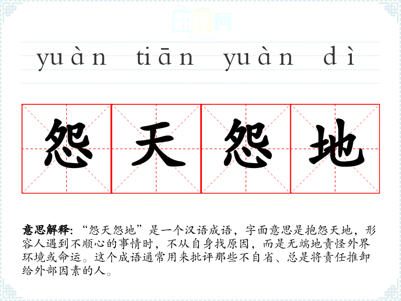 “怨天怨地”是一个汉语成语,字面意思是抱怨天地,形容人遇到不顺心的事情时,不从自身找原因,而是无端地责怪外界环境或命运。这个成语通常用来批评那些不自省、总是将责任推卸给外部因素的人。