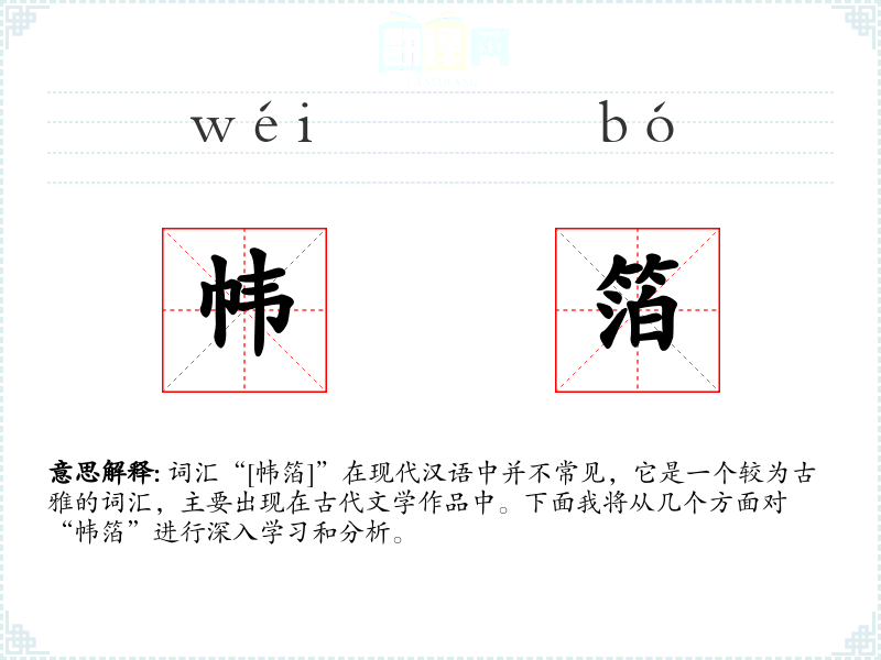 词汇“[帏箔]”在现代汉语中并不常见,它是一个较为古雅的词汇,主要出现在古代文学作品中。下面我将从几个方面对“帏箔”进行深入学*和分析。