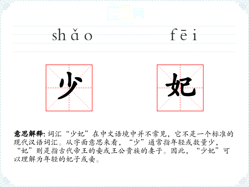 - 词源:“少”源自古代汉语,意为年轻;“妃”源自古代对贵族女性配偶的称呼。