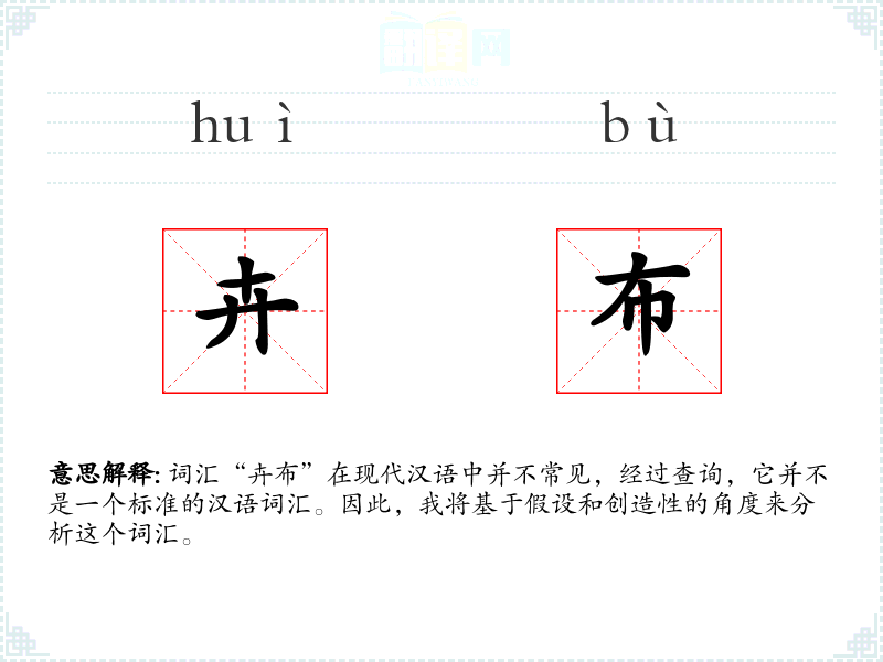 假设“卉布”是一个由“卉”和“布”组成的复合词。其中,“卉”通常指草的总称,如花卉;“布”则指布料或布匹。结合来看,“卉布”可能指的是一种以草或其他植物纤维制成的布料。
