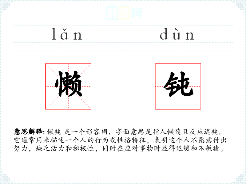 懒钝 是一个形容词,字面意思是指人懒惰且反应迟钝。它通常用来描述一个人的行为或性格特征,表明这个人不愿意付出努力,缺乏活力和积极性,同时在应对事物时显得迟缓和不敏捷。
