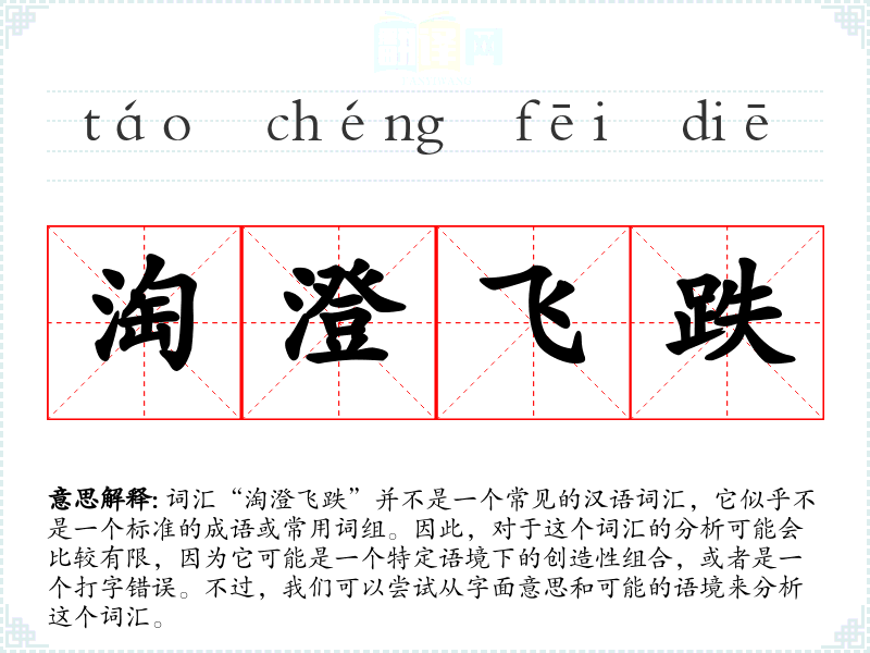 词汇“淘澄飞跌”并不是一个常见的汉语词汇,它似乎不是一个标准的成语或常用词组。因此,对于这个词汇的分析可能会比较有限,因为它可能是一个特定语境下的创造性组合,或者是一个打字错误。不过,我们可以尝试从字面意思和可能的语境来分析这个词汇。
