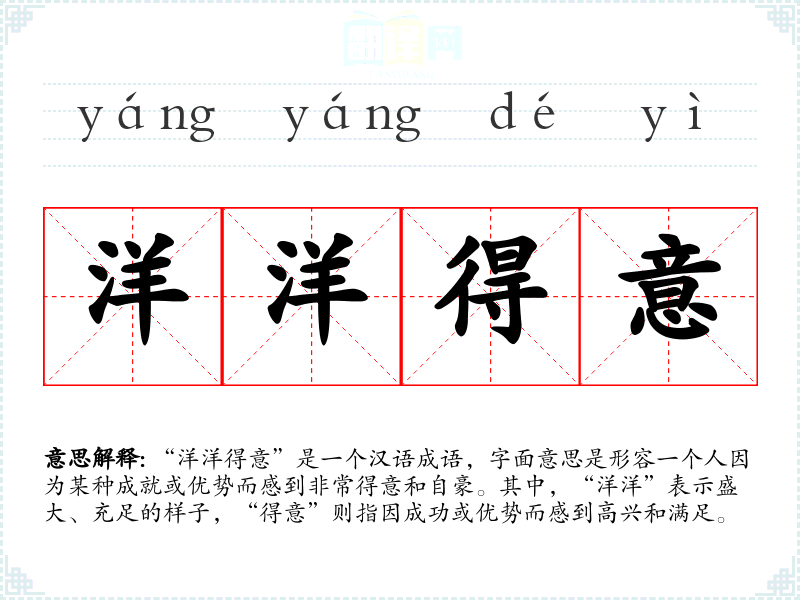 “洋洋得意”是一个汉语成语,字面意思是形容一个人因为某种成就或优势而感到非常得意和自豪。其中,“洋洋”表示盛大、充足的样子,“得意”则指因成功或优势而感到高兴和满足。