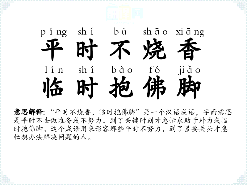 “平时不烧香,临时抱佛脚”是一个汉语成语,字面意思是平时不去做准备或不努力,到了关键时刻才急忙求助于外力或临时抱佛脚。这个成语用来形容那些平时不努力,到了紧要关头才急忙想办法解决问题的人。