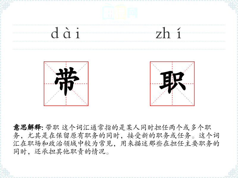 “带职”这个词汇的词源较为直接,由“带”和“职”两个字组成,字面意思即为携带职务。在现代汉语中,这个词汇的使用逐渐固定,主要用于描述同时担任多个职务的情况。