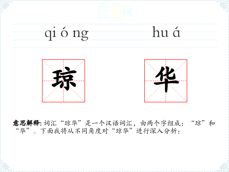词汇“琼华”是一个汉语词汇,由两个字组成:“琼”和“华”。下面我将从不同角度对“琼华”进行深入分析: