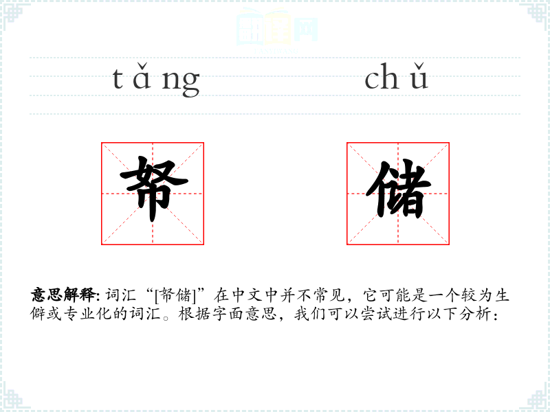 词汇“[帑储]”在中文中并不常见,它可能是一个较为生僻或专业化的词汇。根据字面意思,我们可以尝试进行以下分析: