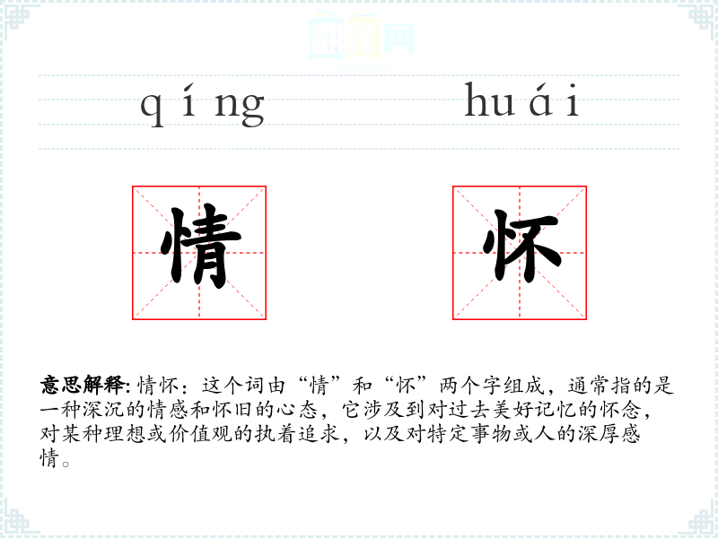 情怀:这个词由“情”和“怀”两个字组成,通常指的是一种深沉的情感和怀旧的心态,它涉及到对过去美好记忆的怀念,对某种理想或价值观的执着追求,以及对特定事物或人的深厚感情。