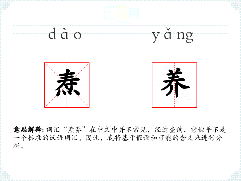 假设“焘养”是一个组合词,其中“焘”可能源自古代汉语,意指光明、照耀,而“养”则指培养、养育。结合起来,“焘养”可能意味着以光明和正面的方式培养或养育某人或某物。