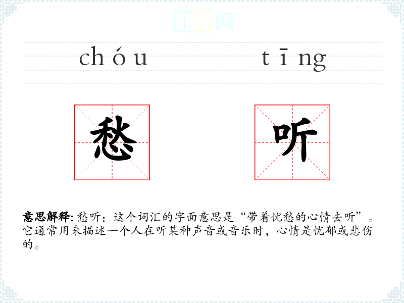 愁听:这个词汇的字面意思是“带着忧愁的心情去听”。它通常用来描述一个人在听某种声音或音乐时,心情是忧郁或悲伤的。