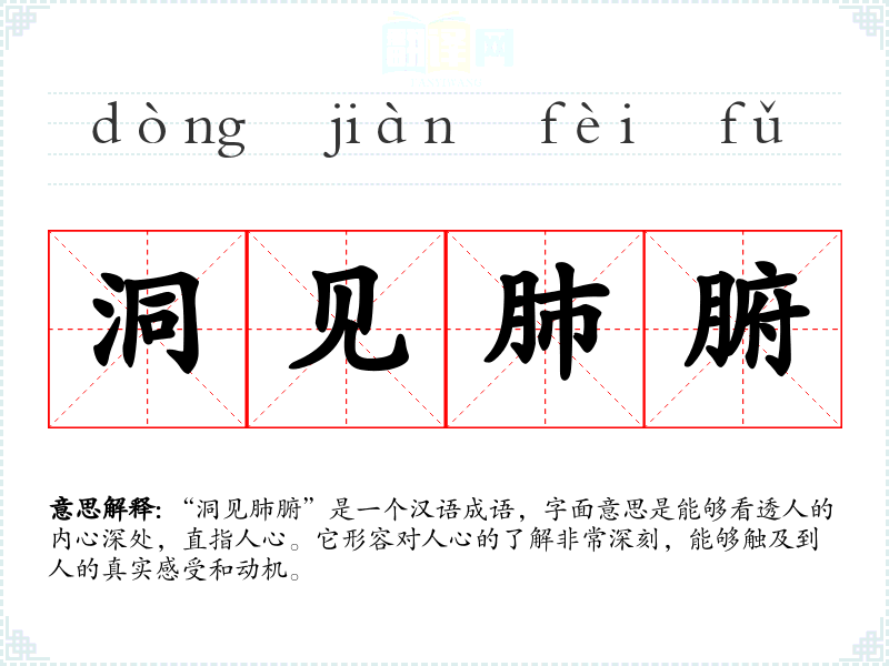 “洞见肺腑”是一个汉语成语,字面意思是能够看透人的内心深处,直指人心。它形容对人心的了解非常深刻,能够触及到人的真实感受和动机。