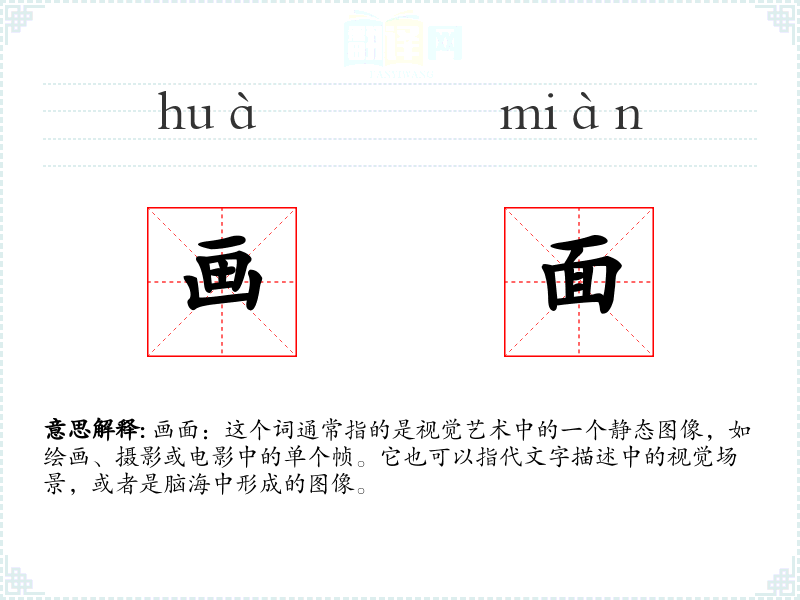 - 反义词:无(因为“画面”是一个中性词,没有直接的反义词)