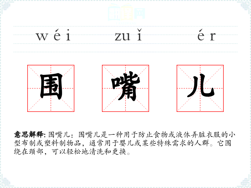 - 反义词:无(围嘴儿是一个特定用途的词汇,没有直接的反义词)
