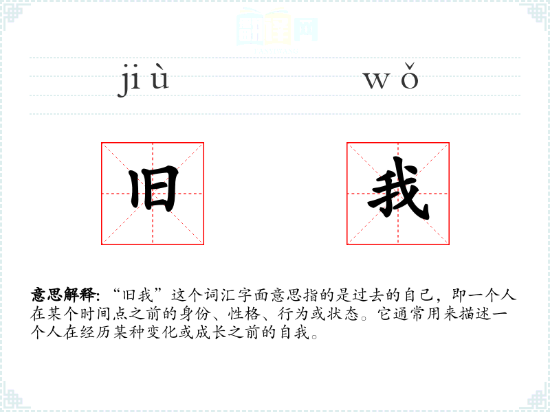 “旧我”这个词汇在中文中直接由“旧”和“我”两个字组成,没有复杂的词源或历史演变。它是一个相对现代的词汇,随着个人成长和自我认知的话题在社会中的普及而逐渐被广泛使用。