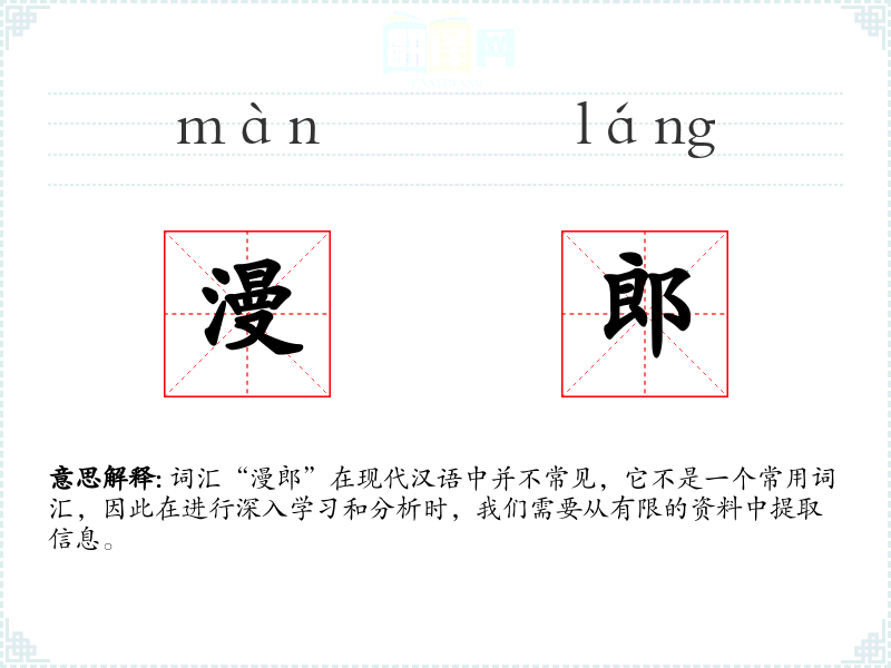 词汇“漫郎”在现代汉语中并不常见,它不是一个常用词汇,因此在进行深入学习和分析时,我们需要从有限的资料中提取信息。