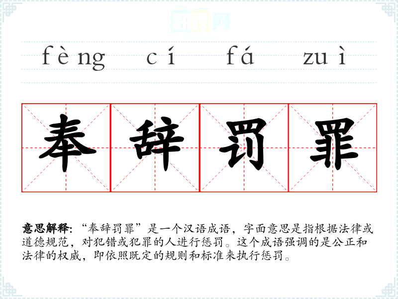 “奉辞罚罪”是一个汉语成语,字面意思是指根据法律或道德规范,对犯错或犯罪的人进行惩罚。这个成语强调的是公正和法律的权威,即依照既定的规则和标准来执行惩罚。